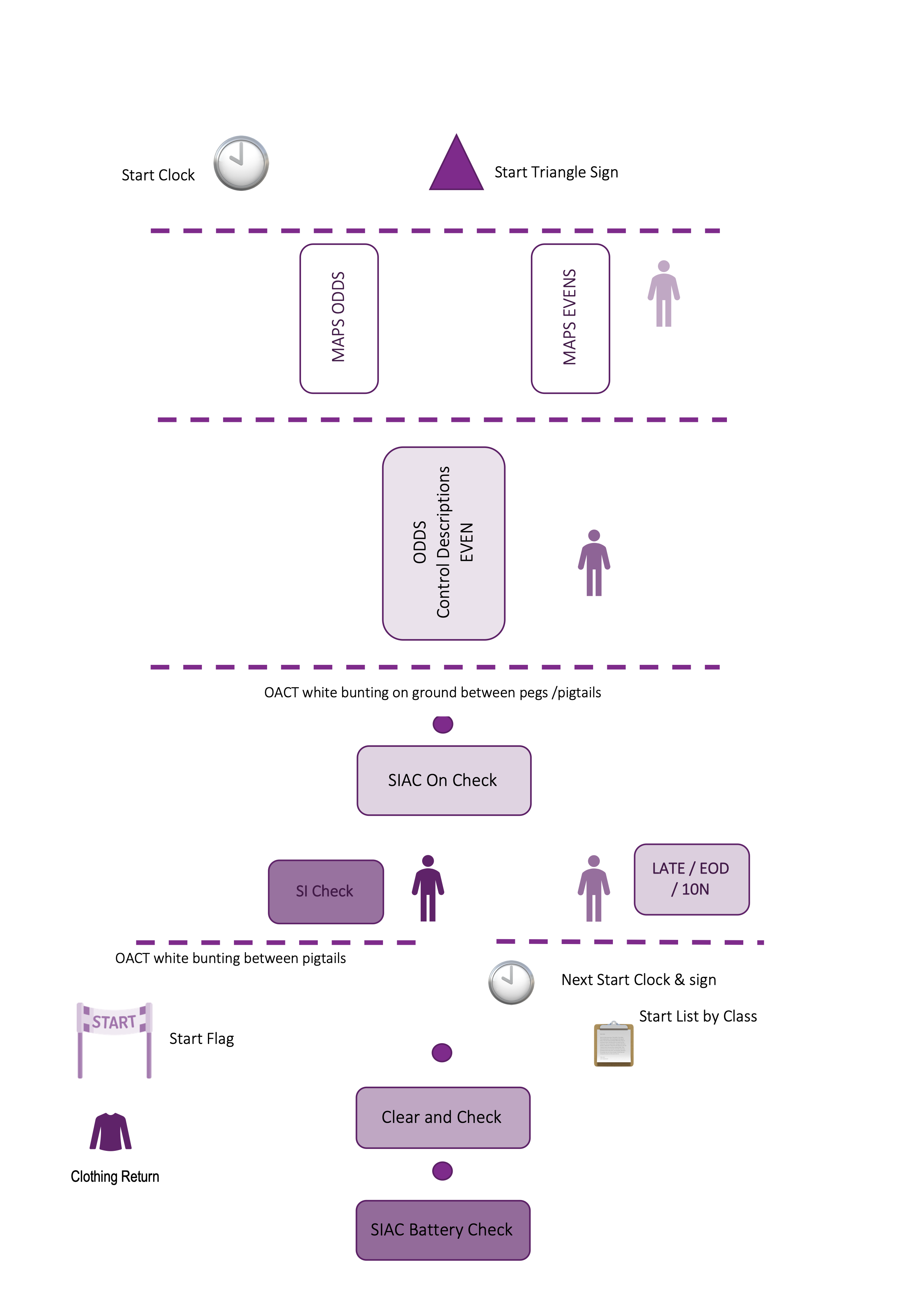 The following diagram shows the overall setup of the start area and process for MIDDLE, SPRINT and LONG events.