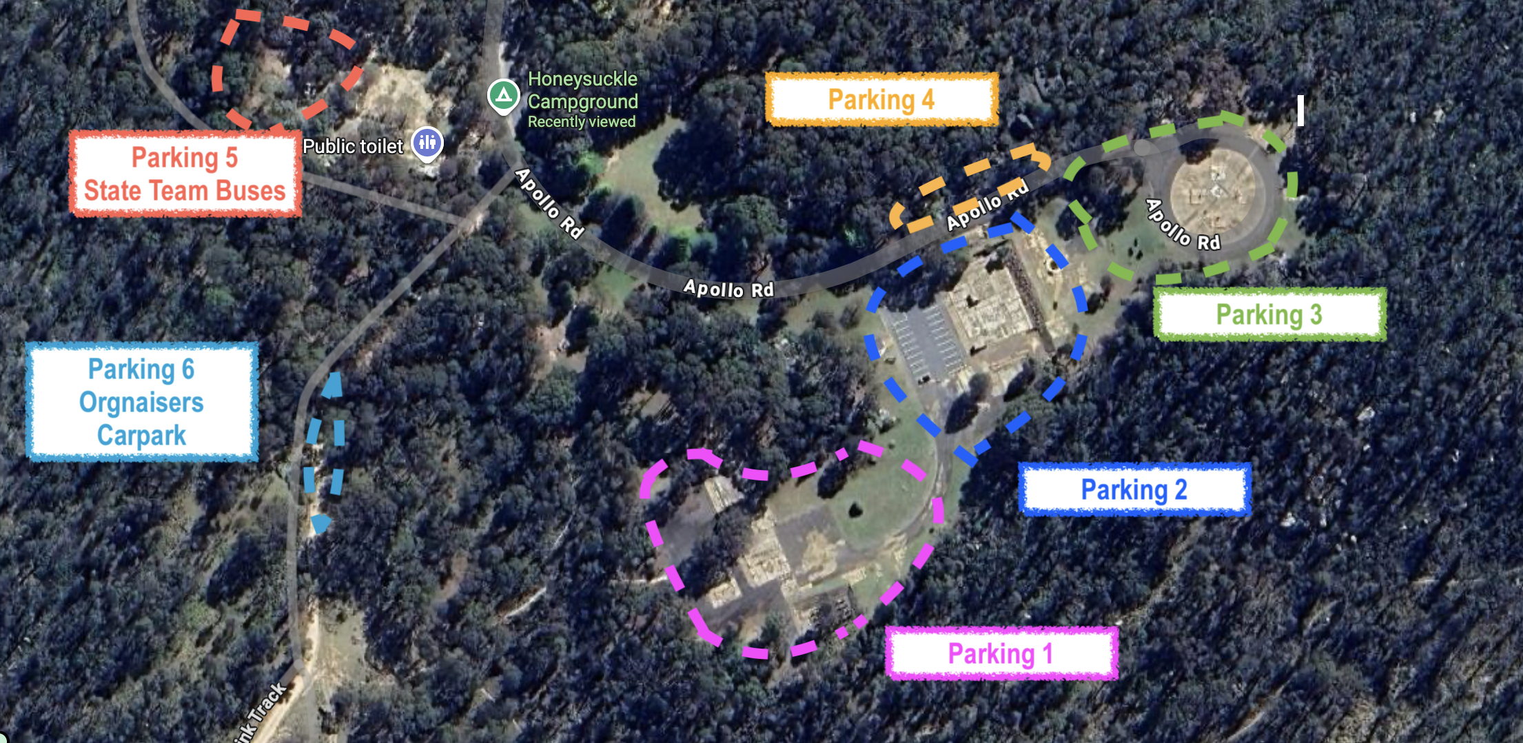 The carpark on the western side of Apollo Road as you approach Honeysuckle is to be kept clear for the general public (non orienteers)