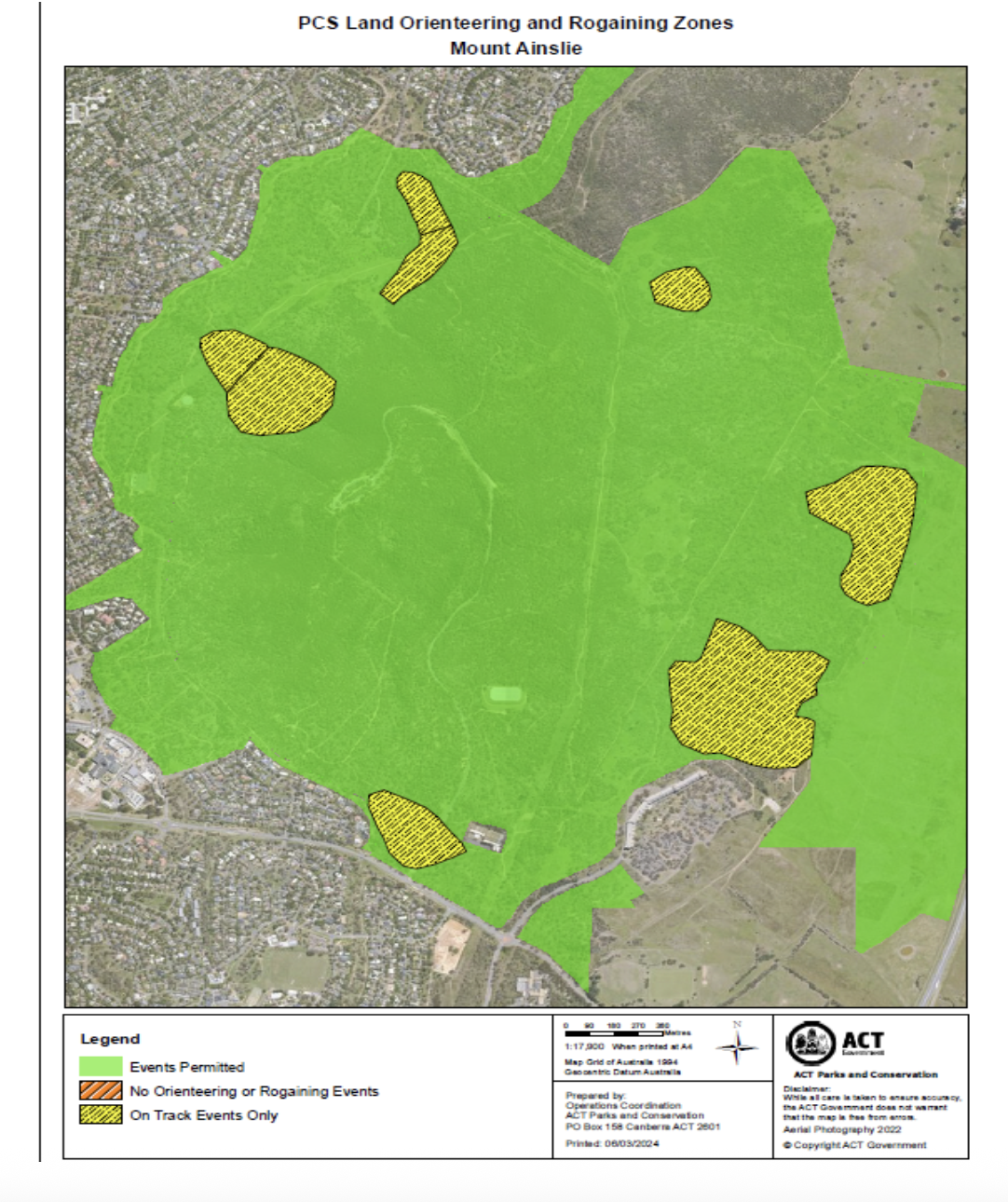 Many reserves have ‘on track events only’ areas marked in yellow on maps provided by PCS. It is the event organisers responsibility to ensure participants do not go off-track in these areas. If an event utilises or is in the vicinity of an ‘on track events only’ area, then the ‘on track only’ condition of use needs to be clearly conveyed on parAcipant maps and in pre-event briefings, and should be monitored and enforced by organisers. |