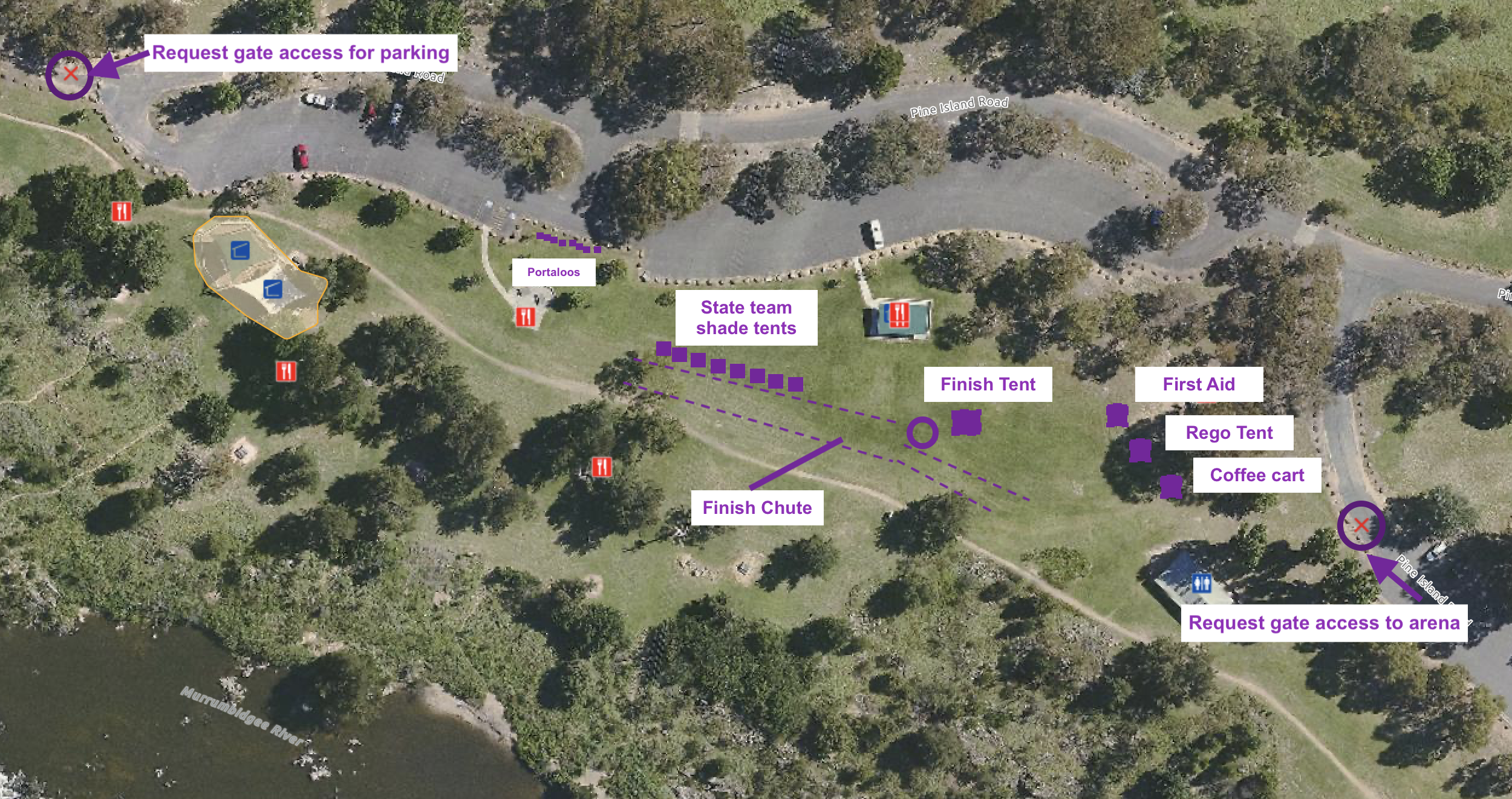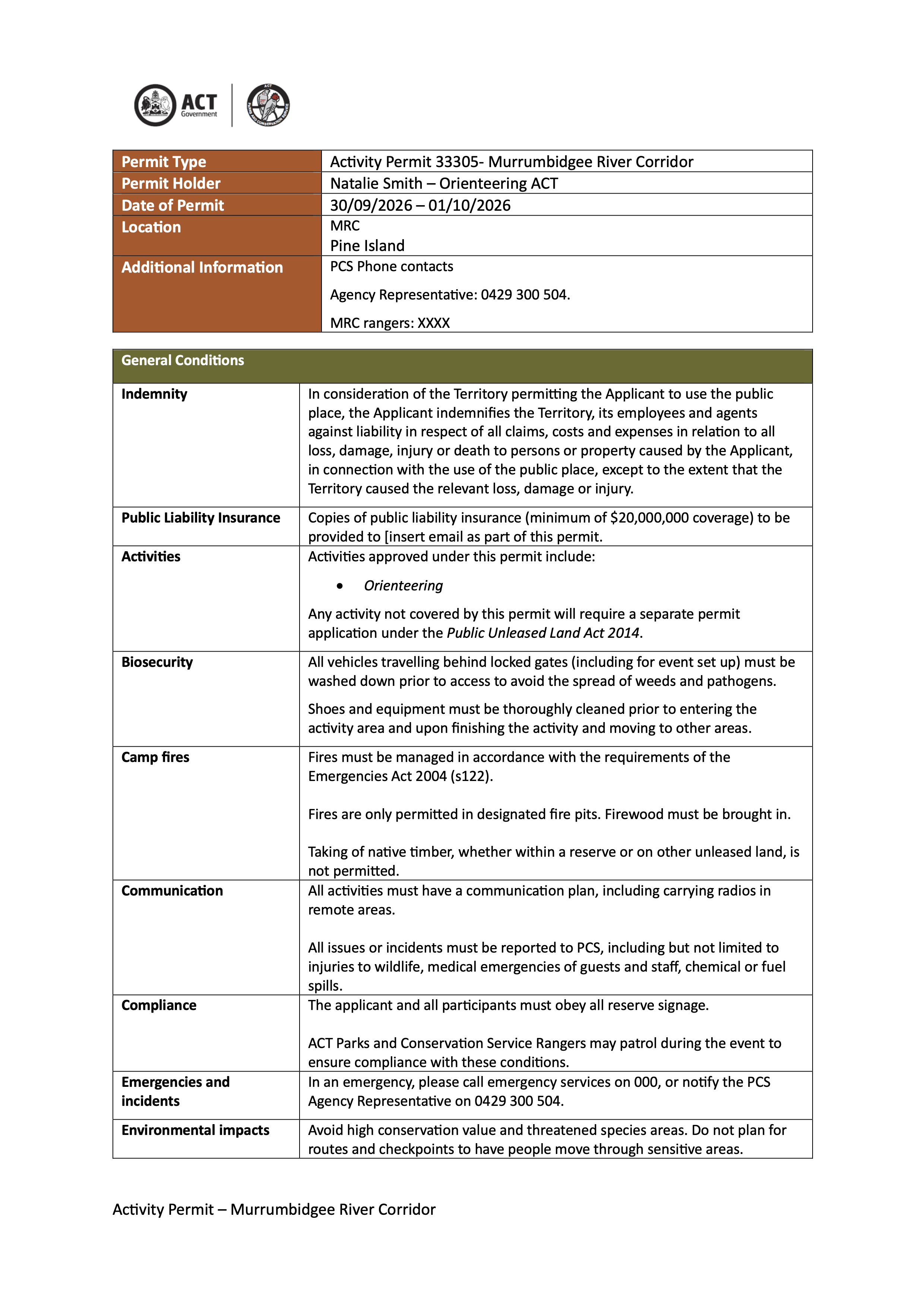 A gate key can be collected from the PCS Murrumbidgee Depot, 1541 Cotter Rd Casuarina Sands, by prior arrangement by calling 02 6207 1808 or emailing MRCCotterDepot@act.gov.au 7 days prior to the event. Alternatively, PCS may install combination locks on course gates and the code provided to the organiser. |