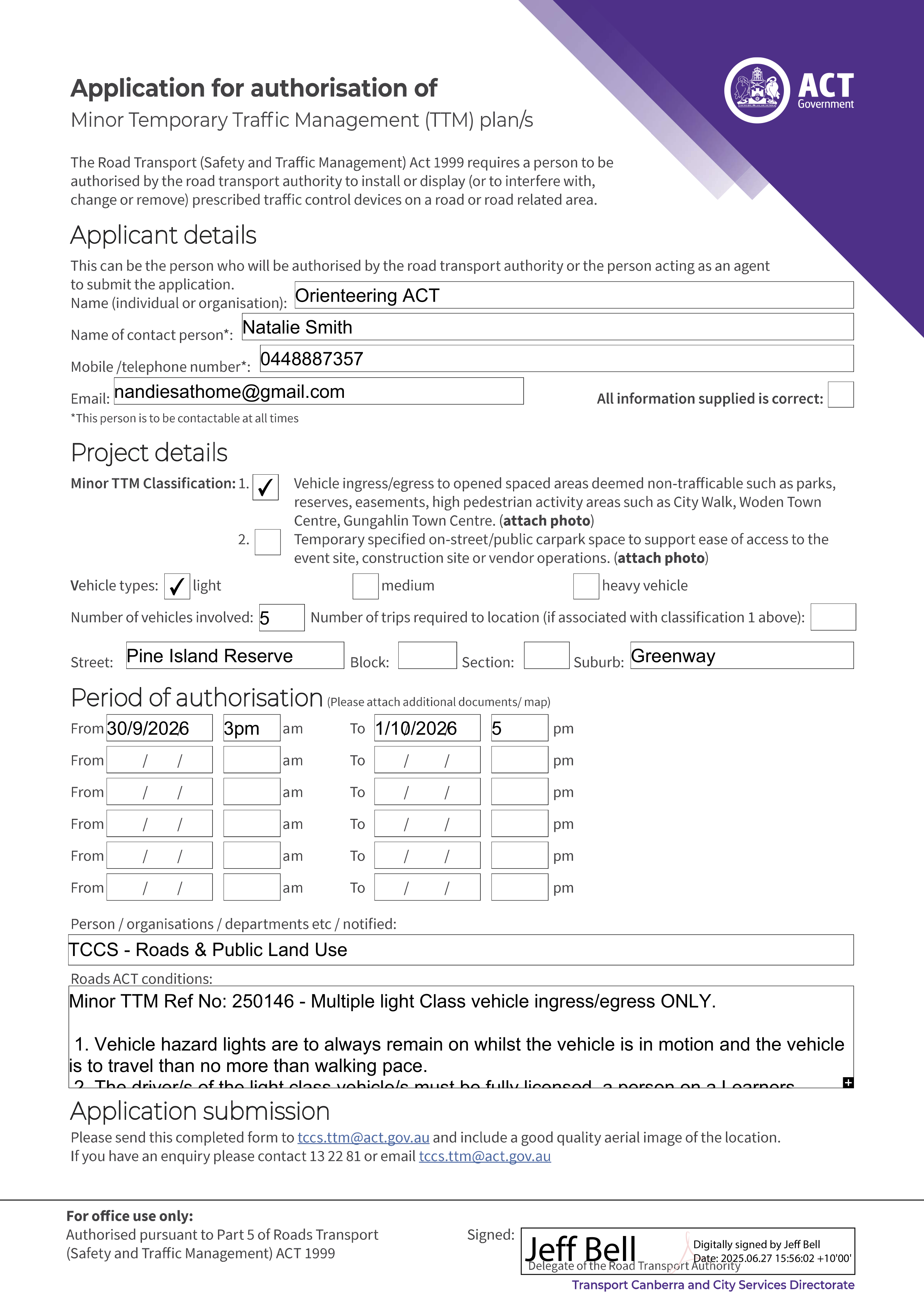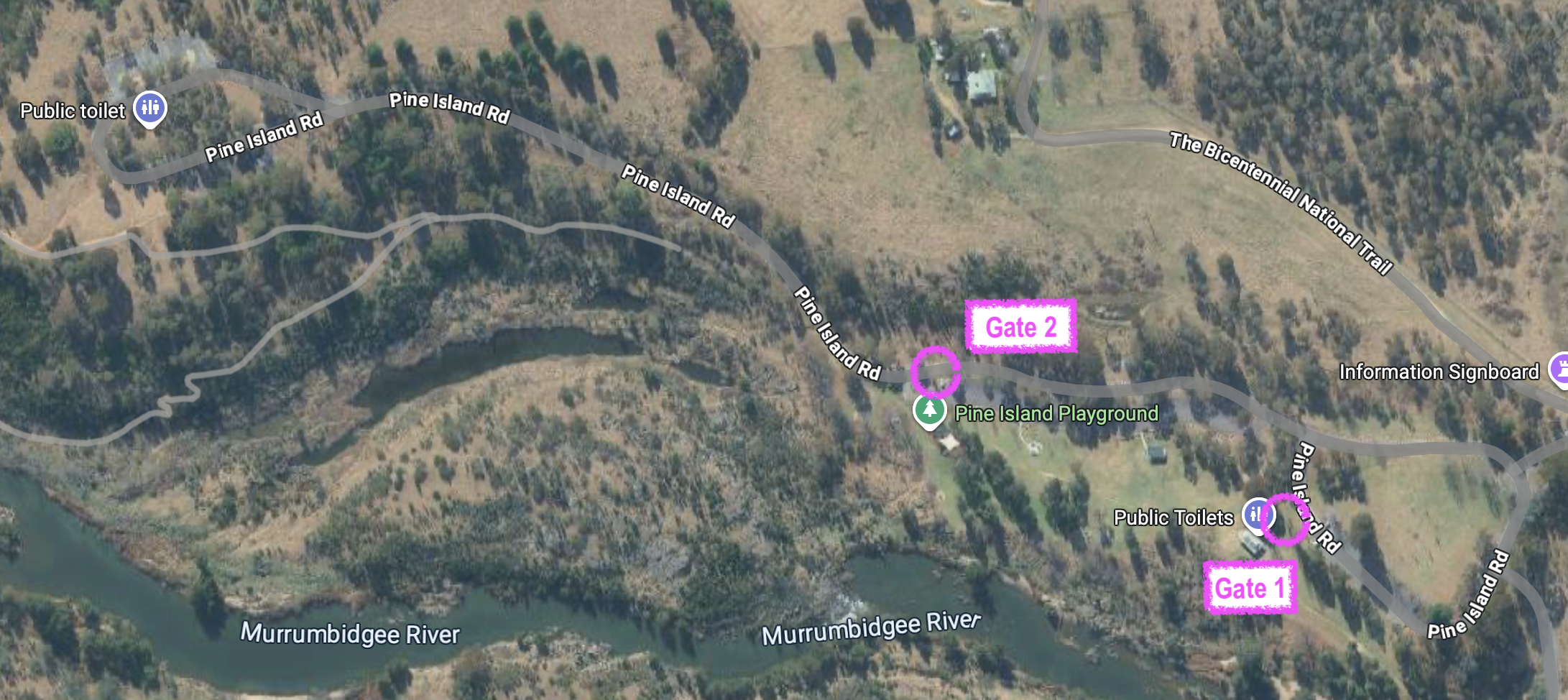 A gate key can be collected from the PCS Murrumbidgee Depot, 1541 Cotter Rd Casuarina Sands, by prior arrangement by calling 02 6207 1808 or emailing MRCCotterDepot@act.gov.au 7 days prior to the event. Alternatively, PCS may install combination locks on course gates and the code provided to the organiser.